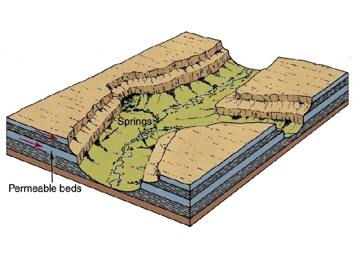 Springs: Natural Discharge n Springs=natural flow of water from the ground surface n n Intersection of water table-ground surface Springs caused by: Aquitards intersecting the ground surface n Faults cutting through aquifer n Fractures in volcanic rock n Road cuts n