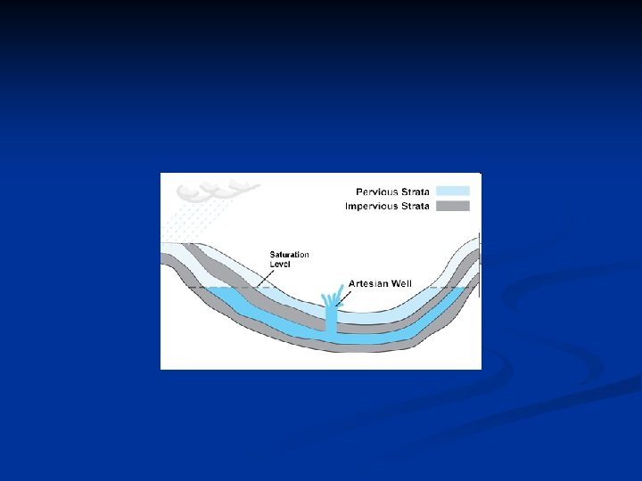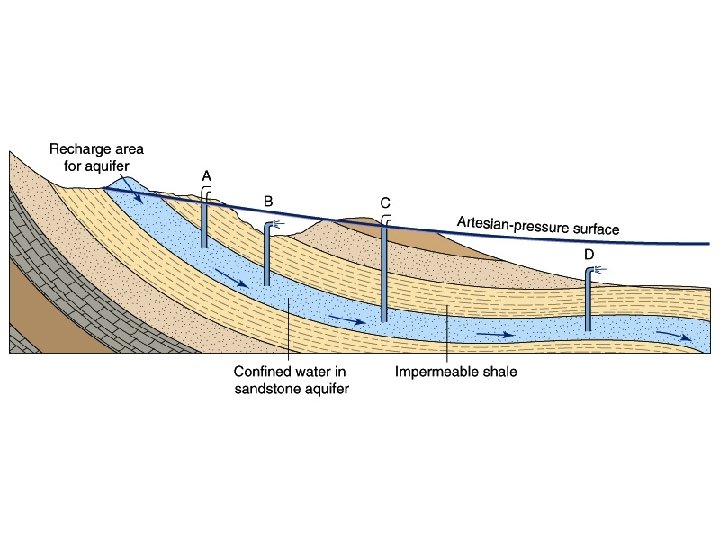 Artesian Wells Artesian Well: water rises above the level where it was tapped. n Can only occur when there is/are n An inclined aquifer where the higher side is exposed at the surface to receive water n Confining layers both above and below the aquifer keep it from moving anywhere except into the well. n