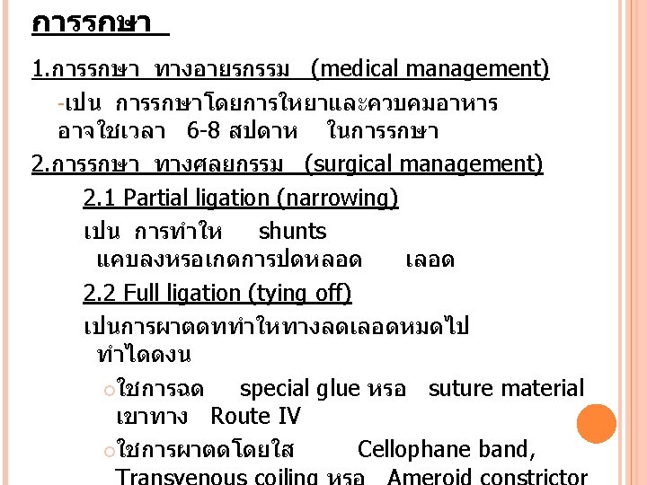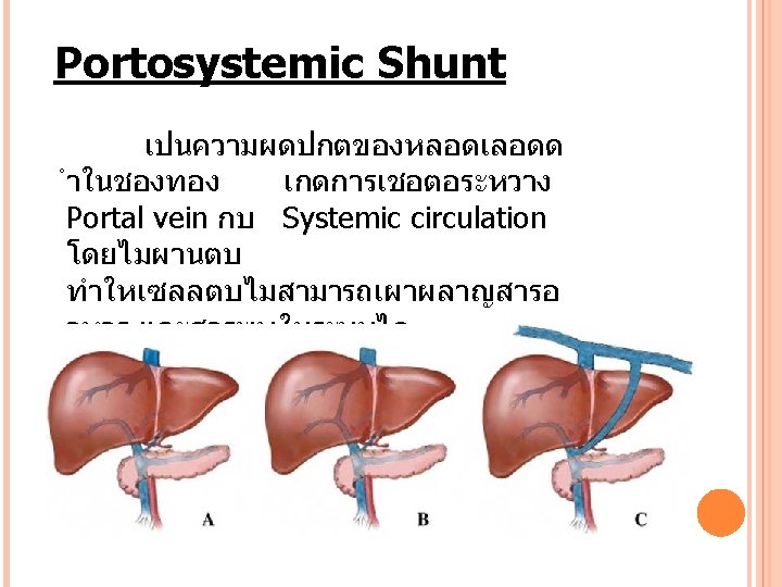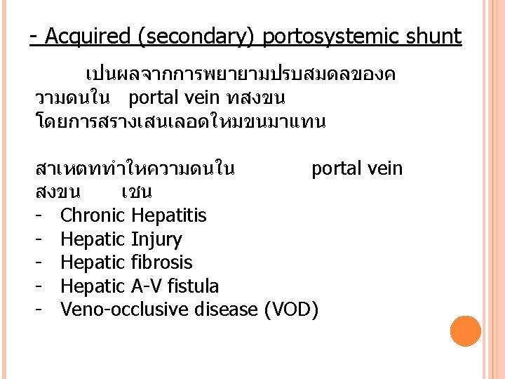 b) Hypoproteinemia, Portosystemic shunt Hypoalbuminemia and decreased A/G ratio -Total Protien 3. 7 g/dl (ปกต 5 -7. 4 g/dl) -Albumin 1. 1 g/dl (ปกต 2. 7 -4. 4 g/dl) -A/G ratio 0. 43 (ปกต 0. 8 -2) Portal hypertension Reduce albumin Hydrostatic pressure oncotic pressure Transudation of fluid Ascite