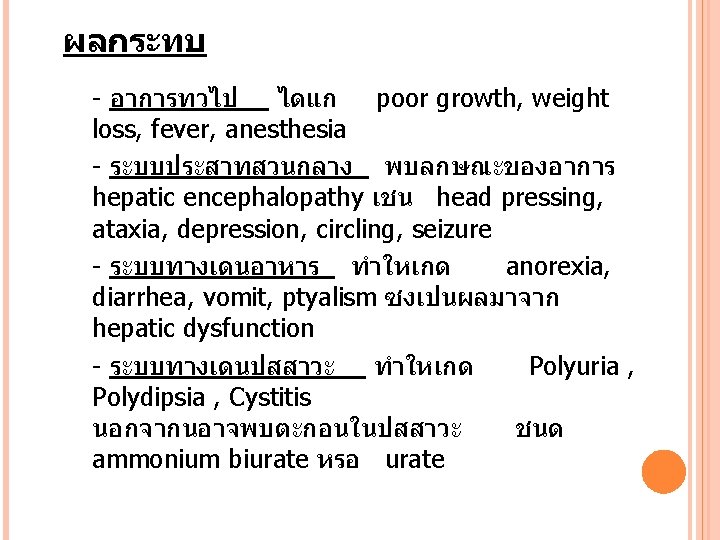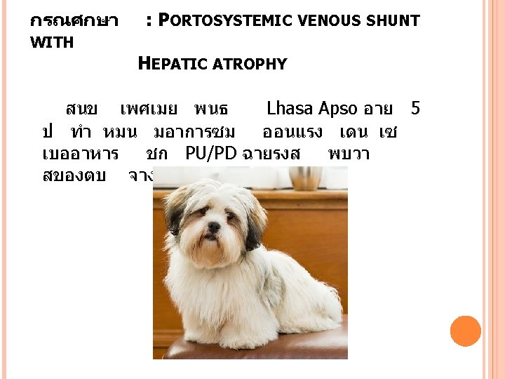 อาการผดปกตทพบในสนขตวน Hepatic insufficiency � � � Hypoglycemia Hypoprotienemia Hypoalbuminemia Decrease A/G ratio Fasting hyperammonemia & Decrease BUN Increase bile acid concentration Hypocholesterolemia Hypocalcemia Hyposthenuria Ammonium biurate crystalluria Proteinuria Hyperbillirubiemia Billirubinuria Mildly increase ALP activity Increase ALT activity Microcytosis