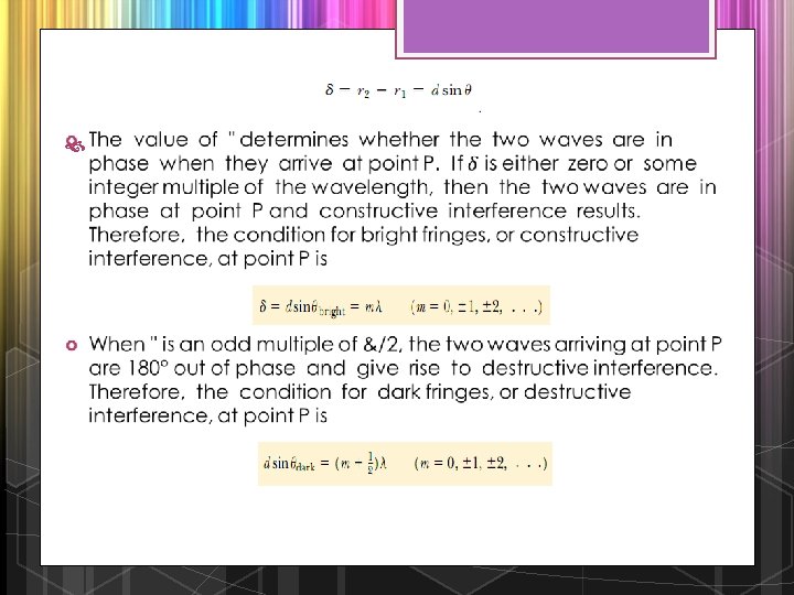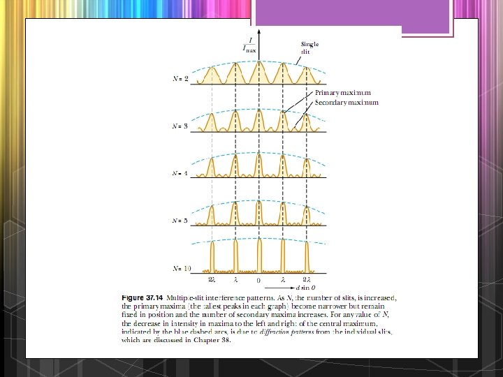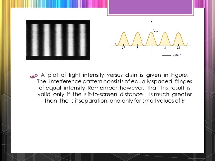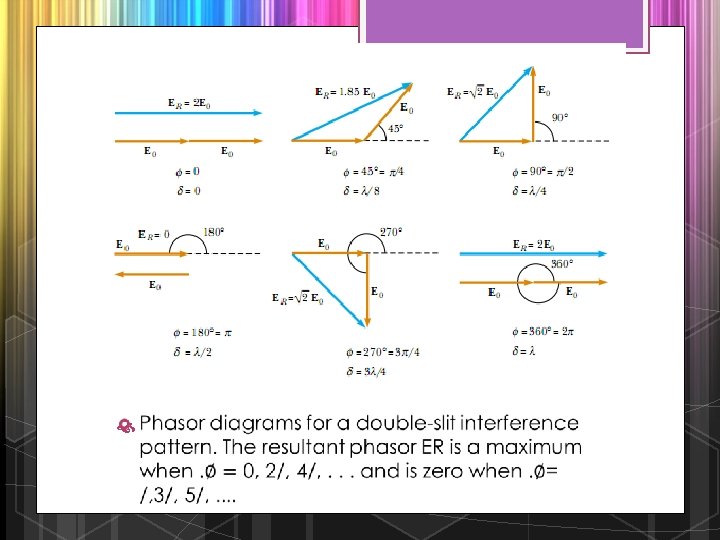 Phasor Diagrams for Two Coherent Sources As an example of the phasor method, consider the interference pattern produced by two coherent sources. The light intensity at a point is a maximum when ER is a maximum; this occurs at. # 0, 2/, 4/, . . The light intensity at some point is zero when ER is zero; this occurs at. # /, 3/, 5/, . . These results are in complete agreement with the analytical procedure described in the preceding section. v Three-Slit Interference Pattern Using phasor diagrams, let us analyze the interference pattern caused by three equally spaced slits. We can express the electric field components at a point P on the screen caused by waves from the individual slits as v