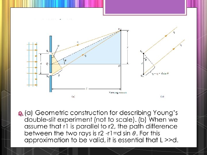Schematic diagram of Young’s double-slit experiment. Slits S 1 and S 2 behave as coherent sources of light waves that produce an interference pattern on the viewing screen (drawing not to scale). An enlargement of the center of a fringe pattern formed on the viewing screen.