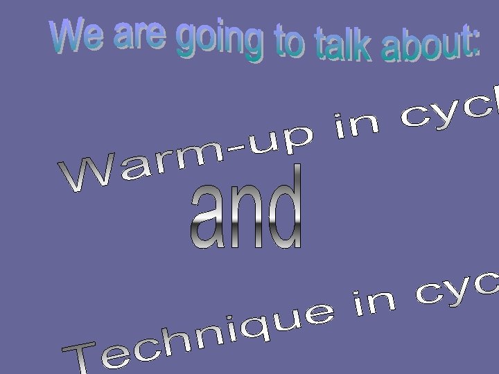 • WHY WARM UP? A warm up helps to prevent muscle injury. Warming up raises your body temperature gradually, gets the muscles and joints ready for activity by increasing the flow of blood to these areas-and gets your mind into gear. • WHY COOL DOWN? Too many people neglect the cool-down at the end of a training session or a race. A cool-down aids recovery, the removal of the waste product known as lactic acid, and helps prevent some of the muscle stiffness and soreness you might otherwise experience after you've been cycling hard. The warm-up, stretch and cool-down is a simple routine that should become part of your normal cycling activity. It doesn't take long, and it will give you that extra edge to perform at your peak level of fitness.