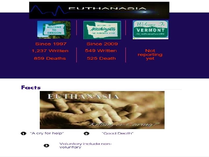 For Euthanasia • Right to choose when to die • Dignified death • End pain and suffering • Promotes quality of life • Save money on drugs and medical bills