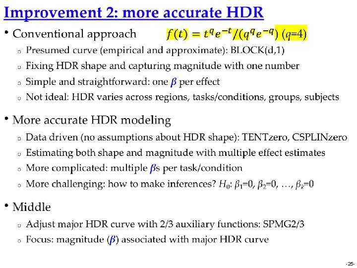 Improvement 2: more accurate HDR • Group analysis with HDR estimates: TENTzero, CSPLINzero o NHST: H 0: β 1=0, β 2=0, …, βk=0 [all responses in HRF = zero] o Area under curve (AUC) approach o § Reduce HRF to one number: use area as magnitude approximation § Ignore shape subtleties § Shape information loss: (undershoot, peak location/width) Better approach: maintaining shape integrity § Take individual βs to group analysis (MVM) § One group with one condition: 3 d. LME § Other scenarios: treat βs as levels of a factor (e. g. , Time) - 3 d. MVM ** Task or group effect: F-stat for interaction between task group and Time, complemented with main effect for task/group (AUC) Chen et al. (2015). Detecting the subtle shape differences in hemodynamic responses at the group level. Front. Neurosci. , 26 October 2015. -26 -