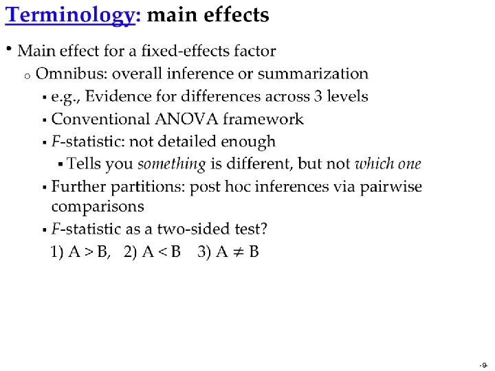Terminology: fixed vs random • Fixed-effects variables o Of research interest § § o Modeled as constants, not random variables § o Visual vs auditory, age, … Unable to extend to something else Shared by all subjects Not exchangeable/replaceable or extendable to something else • Random-effects variables (mean + random part) o Of research interest? § § Subjects: random samples Trials, regions? Modeled as random variables: Gaussian distributions o Exchangeable, replaceable, generalizable o • Differentiations blurred under BML (Bayesian Multi-Level) -8 -