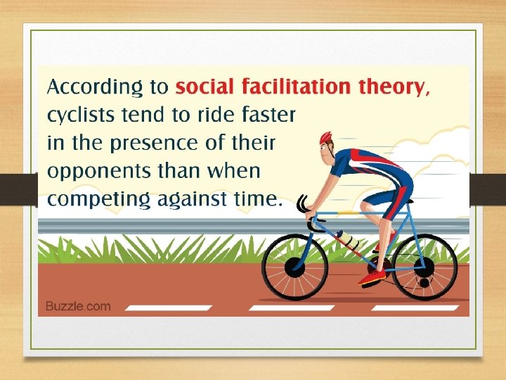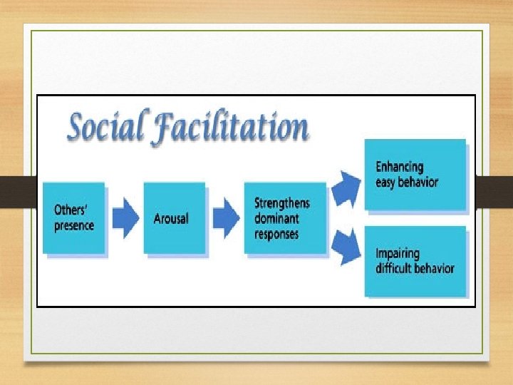 Social Facilitation • Improved performance on simple or welllearned tasks. • BUT, we perform worse on tasks that are difficult for us. • This is due to AROUSAL caused by other’s presence. This arousal strengthens your dominant response.