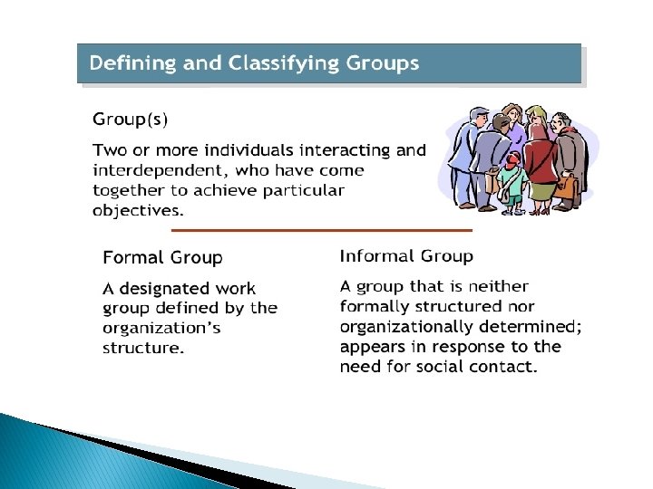Why do people join groups? � Security. By joining a group, individuals can reduce the insecurity of “standing alone”. People feel stronger, have fewer self-doubts, and are more resistant to threats when they are part of a group. � Status. Inclusion in a group that is viewed as important by others provides recognition and status for its members. � Self-esteem. Groups can provide people with feelings of selfworth. That is, in addition to conveying status to those outside the group, membership can also give increased feelings of worth to the group members themselves.