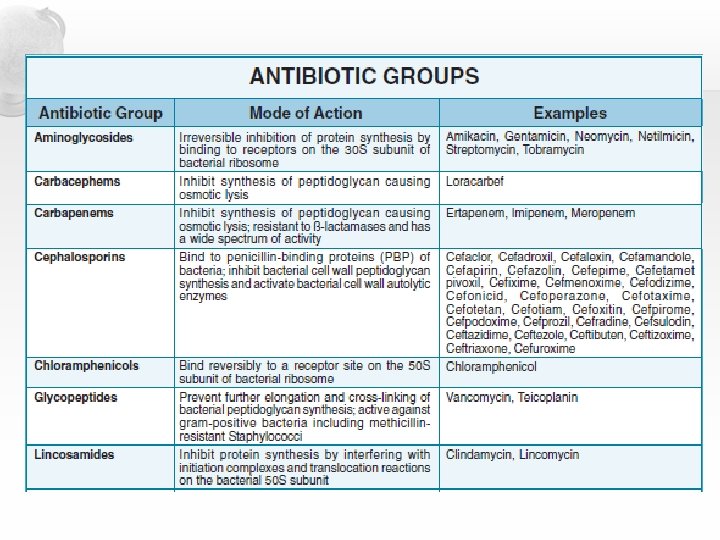 Antibiotic Mode of Action Inhibits cell wall synthesis Natural Penicillin – penicillin G Semi-synthetic penicillin - ampicillin & amoxicillin Polypeptide antibiotics – vancomycin Inhibits protein synthesis Streptomycin Erythromycin Azithromycin Inhibits nucleic acid synthesis Rifampin Quninolones & fluoroquinolones – ciprofloxicin & gatifloxicin Competitive inhibitors Sulfonamides