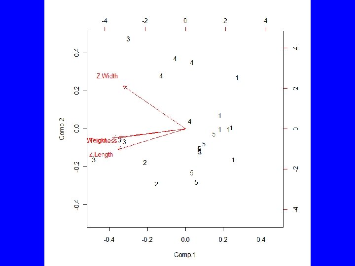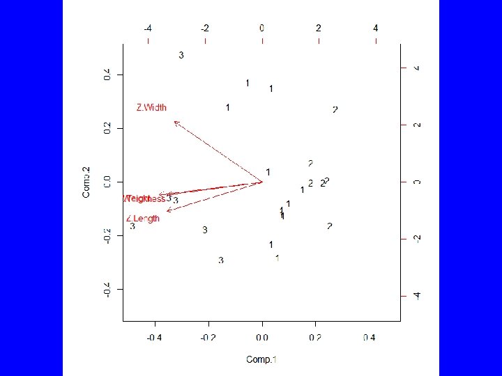 summary(as. factor(cutree(HClust. 1, k = 3))) # Cluster Sizes 1 2 3 11 6 6 by(model. matrix(~-1 + Z. Length + Z. Thickness + Z. Weight + Z. Width, Darl. Points), as. factor(cutree(HClust. 1, k = 3)), mean) # Cluster Centroids INDICES: 1 Z. Length Z. Thickness Z. Weight Z. Width -0. 1345150 -0. 1585615 -0. 2523805 -0. 1241642 ------------------------------INDICES: 2 Z. Length Z. Thickness Z. Weight Z. Width -1. 1085541 -0. 9209550 -0. 9400026 -0. 8200594 ------------------------------INDICES: 3 Z. Length Z. Thickness Z. Weight Z. Width 1. 355165 1. 211651 1. 402700 1. 047694 > biplot(princomp(model. matrix(~-1 + Z. Length + Z. Thickness + Z. Weight + Z. Width, Darl. Points)), xlabs = as. character(cutree(HClust. 1, k = 3)))