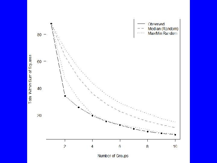 KMPlot. WSS <- function(data, ming, maxg) { WSS <- sapply(ming: maxg, function(x) kmeans(data, centers = x, iter. max = 10, nstart = 10)$tot. withinss) plot(ming: maxg, WSS, las=1, type="b", xlab="Number of Groups", ylab="Total Within Sum of Squares", pch=16) print(WSS) } KMRand. WSS <- function(data, samples, min, max) { KRand <- function(data, min, max){ Rnd <- apply(data, 2, sample) sapply(min: max, function(y) kmeans(Rnd, y, iter. max= 10, nstart=5)$tot. withinss) } Sim <- sapply(1: samples, function(x) KRand(data, min, max)) t(apply(Sim, 1, quantile, c(0, . 005, . 01, . 025, . 975, . 995, 1))) }