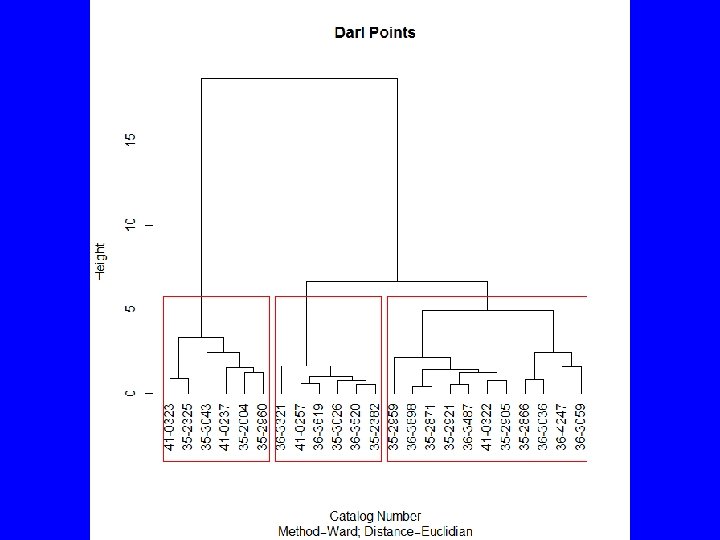 HClust • Rcmdr menus provide – Cluster analysis and plot – Summary statistics by group – Adding cluster to data set • To get traditional dendrogram: – plot(HClust. 1, hang=-1, main= "Darl Points", xlab= "Catalog Number", sub="Method=Ward; Distance=Euclidian") – rect. hclust(HClust. 1, 3)