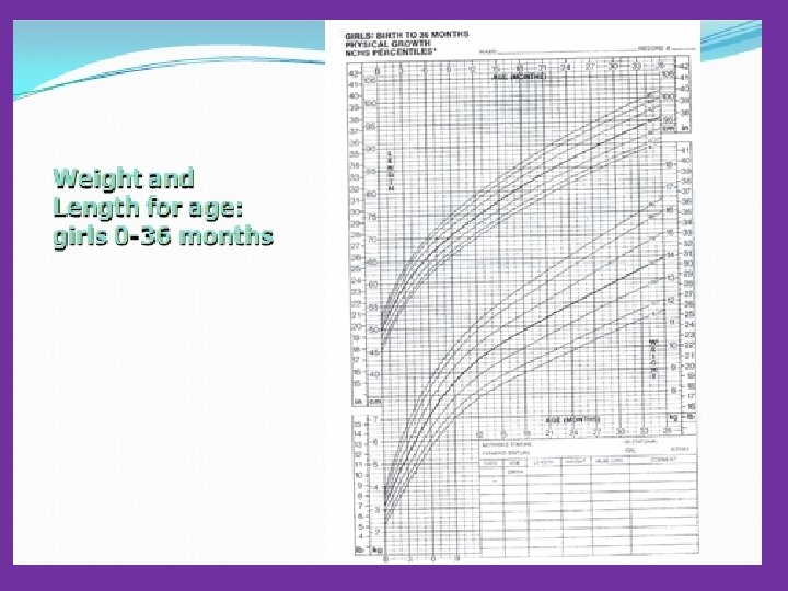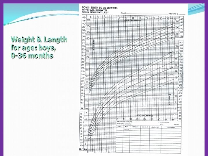 Assessment of growth Recording and follow up of various growth parameter (wt, length, HC, MAC) over a period of time permit early detection of any deviation from normal growth pattern. How Through GROWTH CHARTS, we can compare the growth parameters of a given baby with the growth parameters of a normal baby of same age.