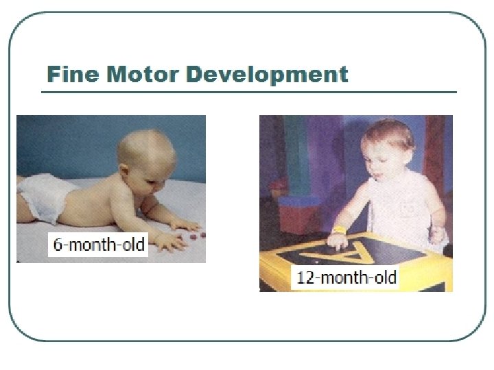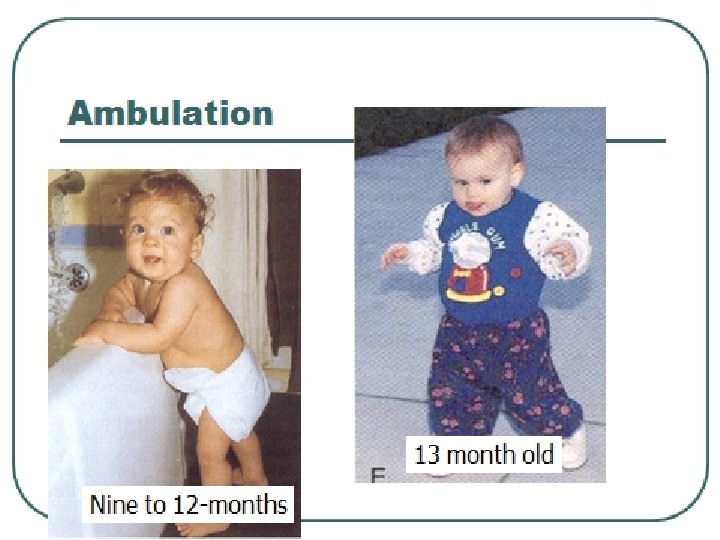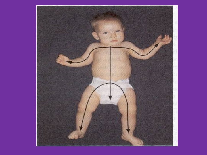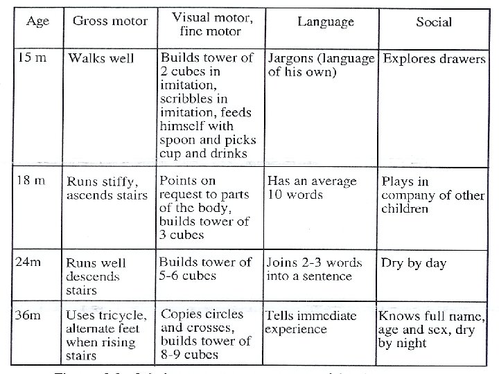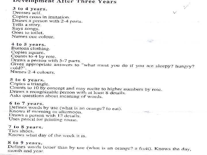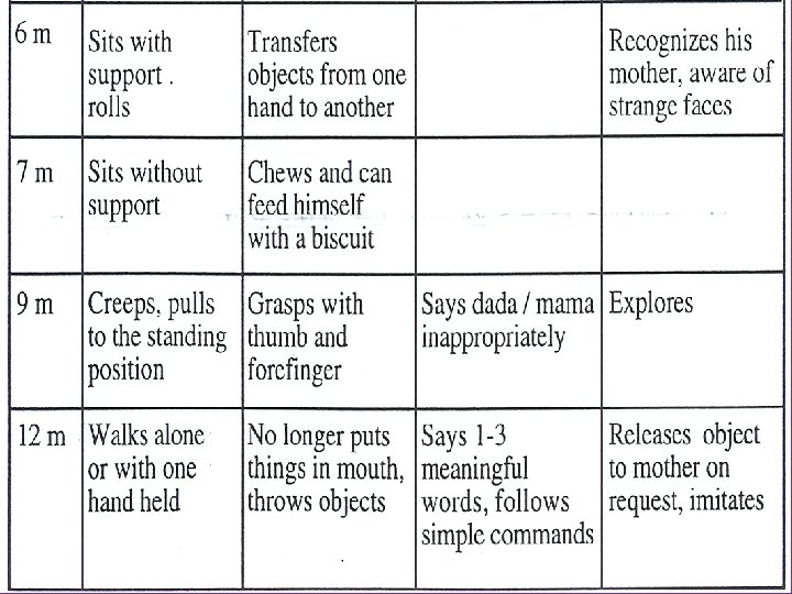 • 9 -10 months: not sitting alone, not reaching or transferring • 11 -12 months: not mobile, no pincer grip, chokes on biscuit, poor attention span. • 12 -15 months: not crawling or pulling up, not responding to speech, persistent mouthing. • 18 months: not walking, no useful speech, clumsy hands, no sustained interest in toys. • 2 years: aimless over activity, little constructive play • 3 -4 years: does not know pictures of common things, does not follow clear orders e. g. put this on the table, cannot use a pencil to scribble or draw a straight line if shown. • 4 -5 years: cannot tell his full name • 6 years: cannot know colors: yellow, green, red and blue.