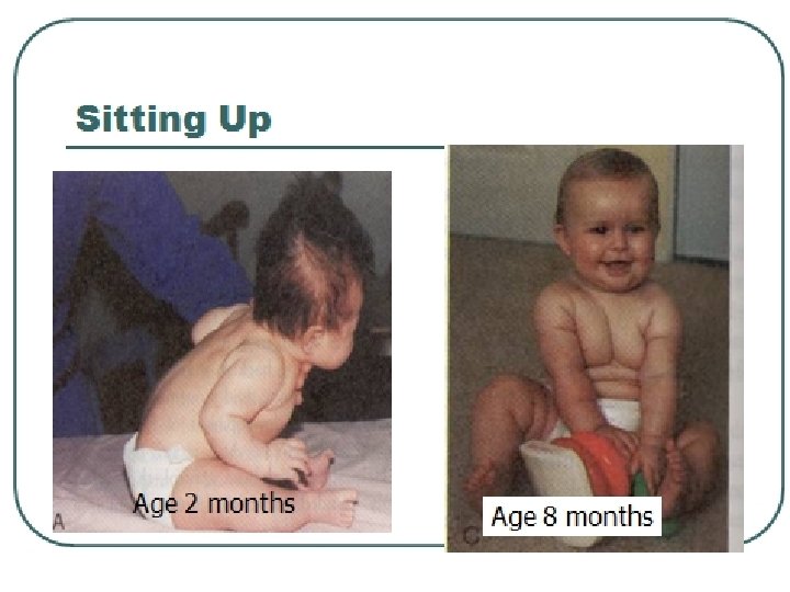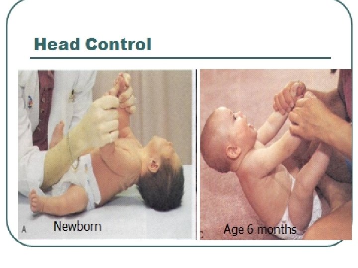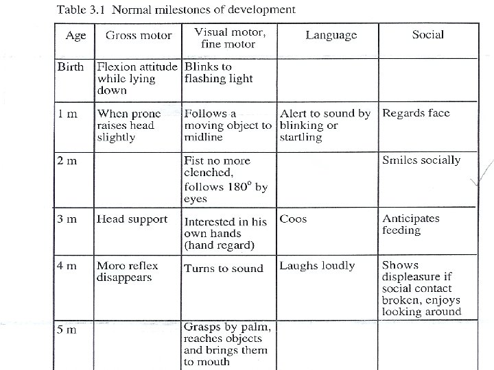 Warning signs of poor development • One week: poor feeding, abnormal posture, hypotonia, absent Moro reflex, convulsions. • 6 weeks: no face regard • 3 months: not smiling responsively, clenched hands. • 4 months: poor head control, content to lie, no interest in own hands. • 6 months: persistent Moro reflex, head lag on pull up, persistent hand play little interest in toys