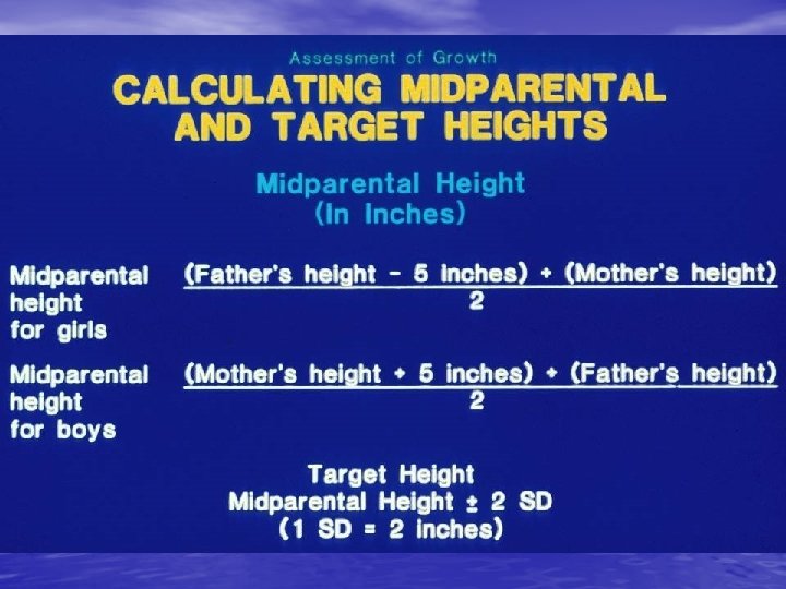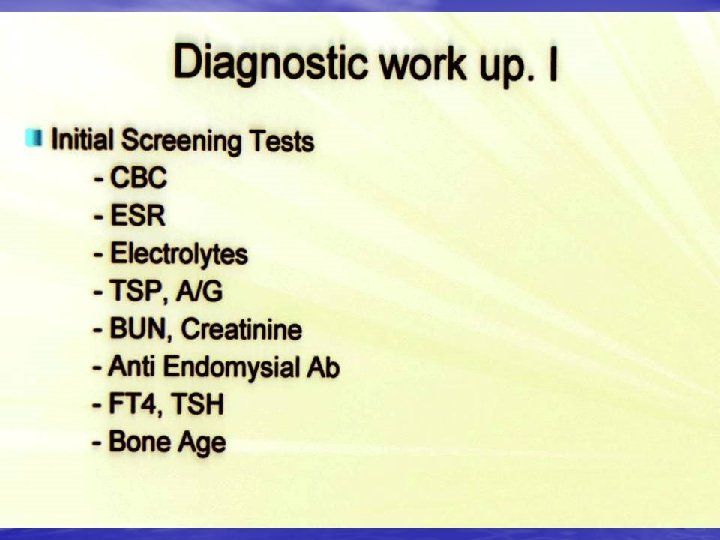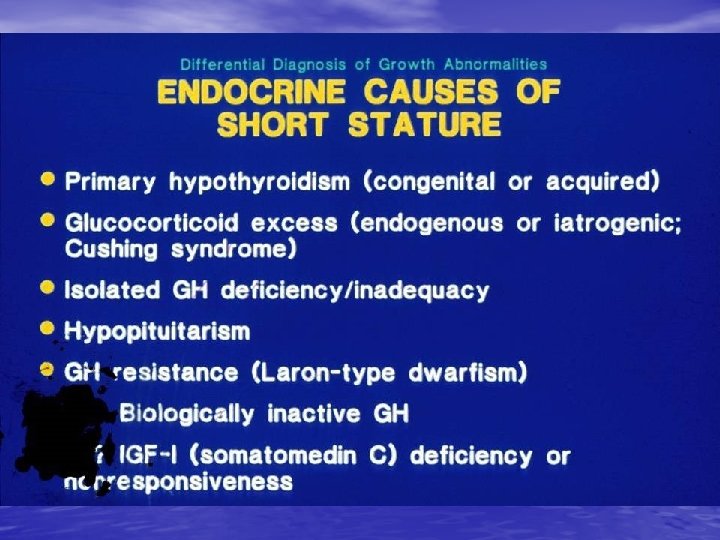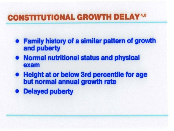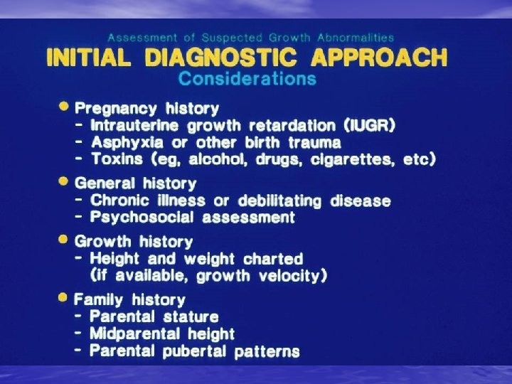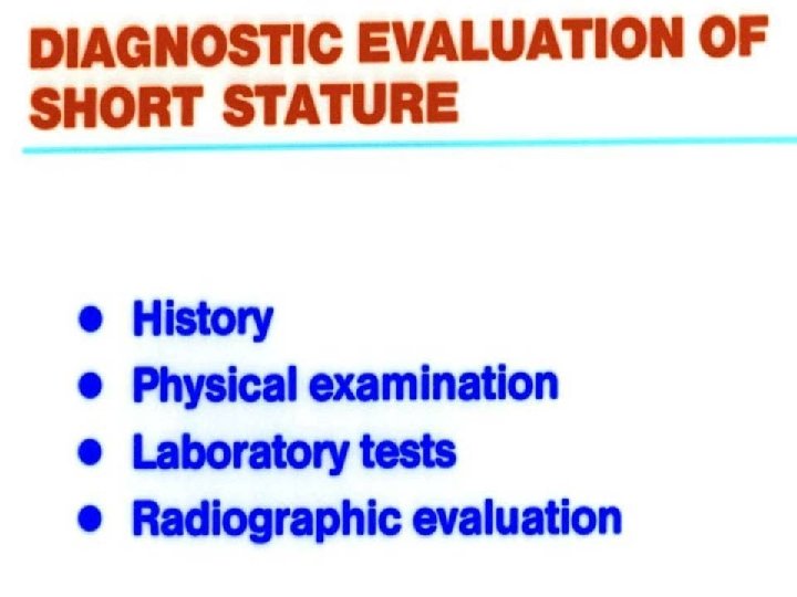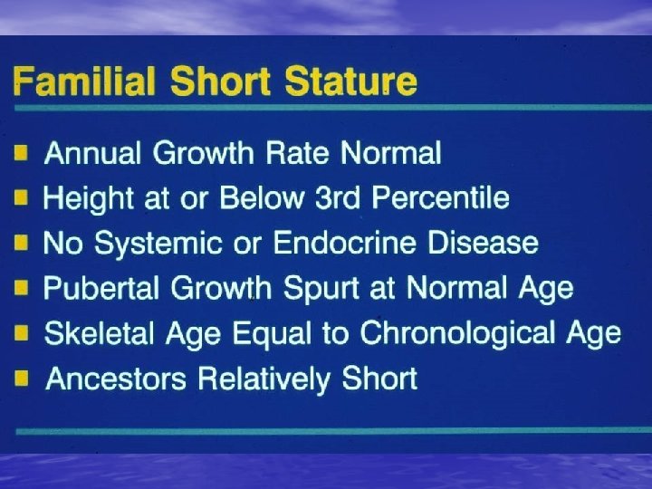 CLASSIFICATION OF SHORT STATURE PATHOLOGIC NORMAL VARIANTS • Familiar short stature • Constitutional growth delay PROPORTIONATE PRENATAL DISPROPORTIONATE • Skeletal dysplasia • Rickets • Intrauterine growth retardation (IUGR) • Placental diseases • Infections • Teratogens • Dysmorphic syndromes • Chromosomal disorders POSTNATAL • Malnutrition • Chronic diseases • Gastrointestinal • Cardiopulmonary • Infections • Renal • Hematologic • Drugs • Psychosocial dwarfism • Endocrine disorder