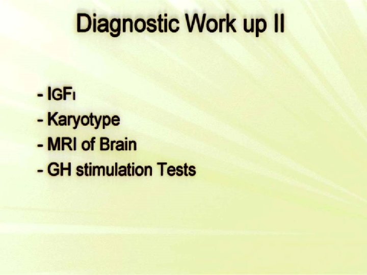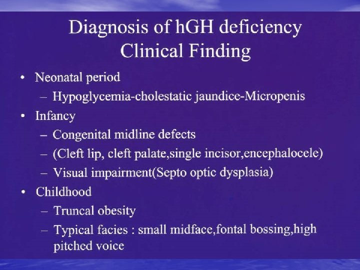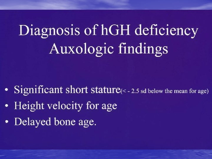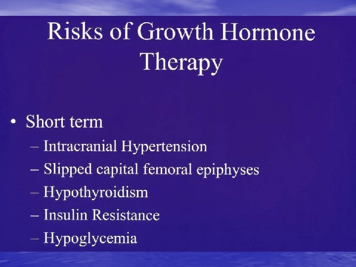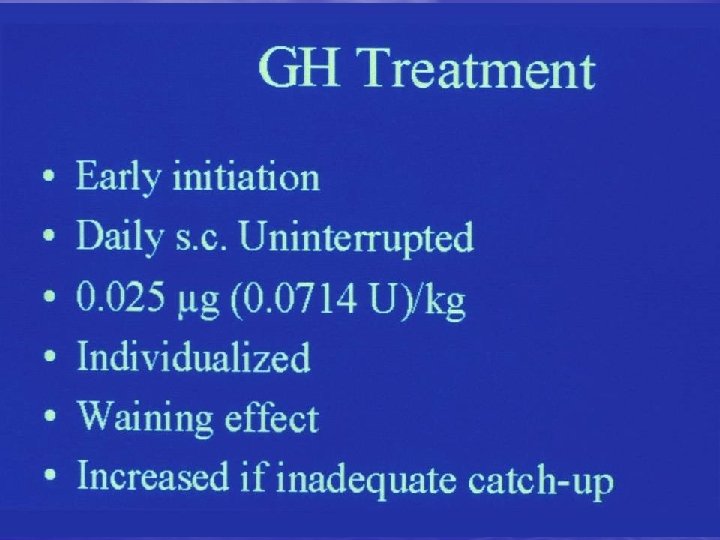 Accepted indications for GH therapy • Childhood GH deficiency • Growth failure associated with chronic renal insufficiency • Turner syndrome • IUGR • Adults with GH deficiency