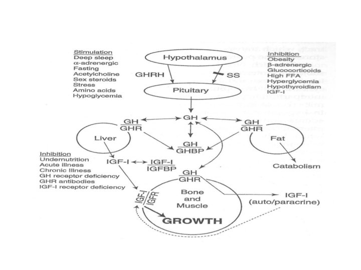 Normal regulation of GH • The neurone system regulating GHRH and GHRH release receives a variety of normal impulses. Impulses arising in the hippocampus are stimulatory whereas those arising in the amygdaloid nuclei can be either stimulatory or inhibitory. The inhibitory inputs are presumed to activate GHRIH release via the anterior somatostinergic pathways, the stimulatory pathway is by way of the ventromedial(VM) nucleus of the hypotalamus