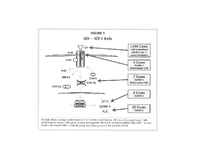 • Peripheral target tissue abnormalities - a diminished or absent hormone receptor or tissue enzyme defect Laron type “dwarfism” – failure of IGF 1 generation in response to GH (A GH receptor defect) - Disorders related to the interaction of the IGF’s or other related peripheral growth factors with chondrocytes and mucopolysaccharides in epiphyseal growth cartilage Pygmies: genetic defect in IGF-1 responsiveness associated with diminished IGF-1 binding