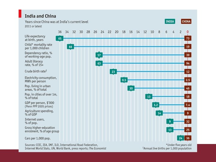 The contenders Estimated overtaking dates based on GDP at PPPs Estimated overtaking dates based on GDP at MERs E 7 vs G 7 2017 2032 China vs US 2018 2032 India vs Japan 2011 2028 Russia vs Germany 2014 2042 Brazil vs UK 2013 2023 Mexico vs France 2028 2046 Indonesia vs Italy 2030 2039 Turkey vs Canada 2020 2035