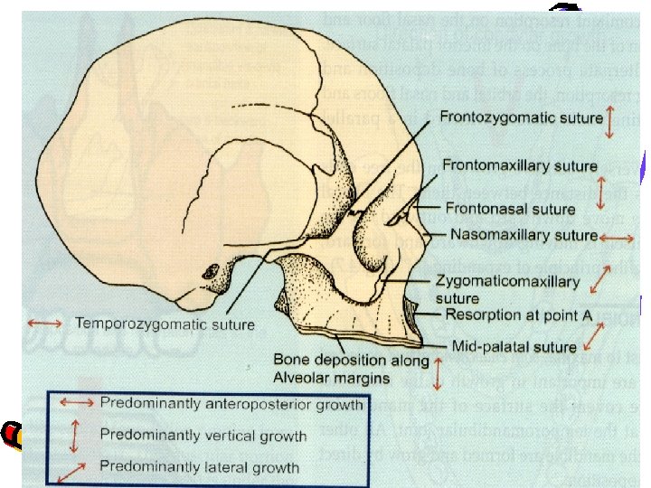 2) Growth at sutures: . - Sutural connective tissue, - Proliferation - Ossification - Surface apposition - Resorption - Translation are the mechanisms for maxillary growth. - Maxilla is related to cranium at least partially by the, - Frontomaxillary suture - Zygomaticotemporal suture - Pterygogopalatine suture These sutures are all oblique & more or les parallel with each other. The growth in these areas would serve to move the maxilla downward & forward.