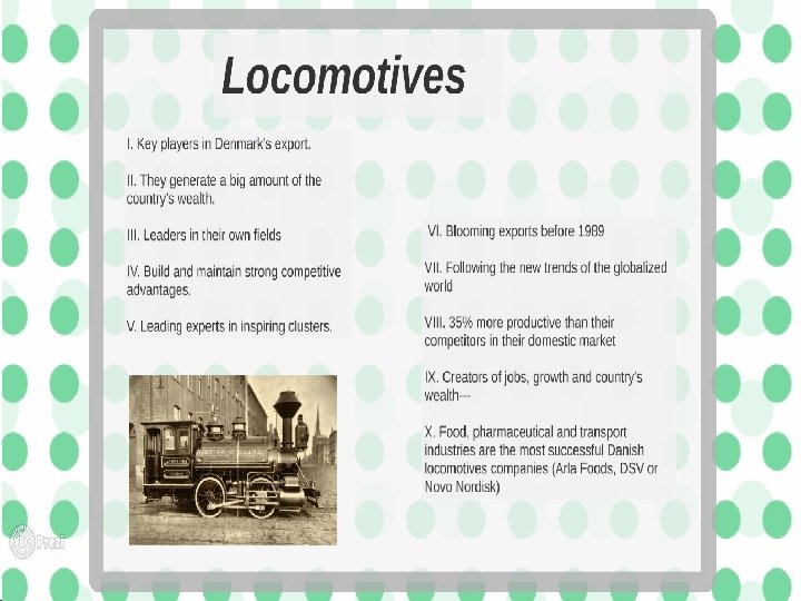Locomotives Key players in Denmark’s export. They generate a big amount of the country’s wealth. Leaders in their own fields Build and maintain strong competitive advantages. Leading experts in inspiring clusters. Blooming exports before 1989 Following the new trends of the globalised world 35% more productivity than their competitors in their domestic market Creators of jobs, growth and country’s wealth Food, pharmaceutical and transport industries are the most successful Danish locomotives companies (Arla Foods, DSV or Novo Nordisk) In the globalised world there is a big demand for highly mobile workforce. For example: A. P. Møller - Mærsk – Shipping Industry The A. P. Moller - Maersk Group is a worldwide conglomerate which operates in 130 countries with a workforce of over 89. 000 employees. A. P. Møller - Mærsk is Denmark's largest company and one of the largest shipping companies in the world. The group is also active in the energy sector, logistics, retail and manufacturing industries. Revenue (2013): 47 billion US Dollars Net Profit: 5. 2 US Billion Dollars