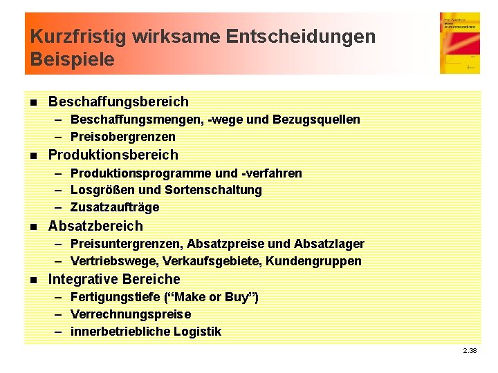 Güterverbräuche und Gütererstellungen n Erklärbar aus zeitlichen Verwerfungen von – Einzahlungen, Leistungen – Auszahlungen, Kosten n Kriterium ist das Auslösen von Zahlungen durch Maßnahmen der laufenden Periode n Berücksichtigung von Zinseffekten – Zinsen auf das durchschnittlich gebundene Kapital 2. 37