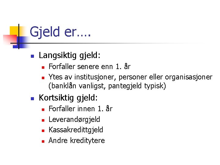 Gjeld er…. n Langsiktig gjeld: n n n Forfaller senere enn 1. år Ytes av institusjoner, personer eller organisasjoner (banklån vanligst, pantegjeld typisk) Kortsiktig gjeld: n n Forfaller innen 1. år Leverandørgjeld Kassakredittgjeld Andre kreditytere
