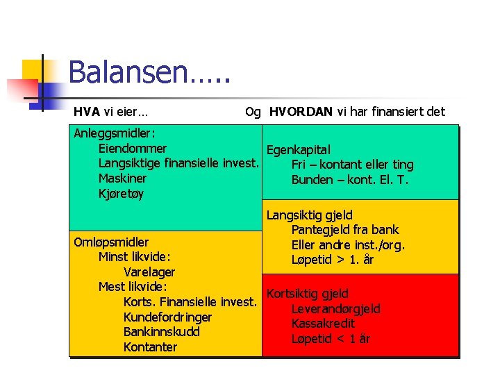 Balansen…. . HVA vi eier… Og HVORDAN vi har finansiert det Anleggsmidler: Eiendommer Egenkapital Langsiktige finansielle invest. Fri – kontant eller ting Maskiner Bunden – kont. El. T. Kjøretøy Langsiktig gjeld Pantegjeld fra bank Eller andre inst. /org. Løpetid > 1. år Omløpsmidler Minst likvide: Varelager Mest likvide: Kortsiktig gjeld Korts. Finansielle invest. Leverandørgjeld Kundefordringer Kassakredit Bankinnskudd Løpetid < 1 år Kontanter