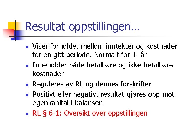 Resultat oppstillingen… n n n Viser forholdet mellom inntekter og kostnader for en gitt periode. Normalt for 1. år Inneholder både betalbare og ikke-betalbare kostnader Reguleres av RL og dennes forskrifter Positivt eller negativt resultat gjøres opp mot egenkapital i balansen RL § 6 -1: Oversikt over oppstillingen
