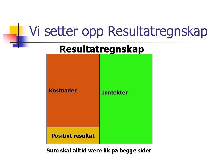 Vi setter opp Resultatregnskap Kostnader Inntekter Positivt resultat Sum skal alltid være lik på begge sider