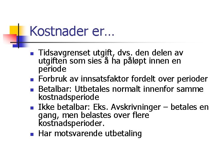 Kostnader er… n n n Tidsavgrenset utgift, dvs. den delen av utgiften som sies å ha påløpt innen en periode Forbruk av innsatsfaktor fordelt over perioder Betalbar: Utbetales normalt innenfor samme kostnadsperiode Ikke betalbar: Eks. Avskrivninger – betales en gang, men belastes over flere kostnadsperioder. Har motsvarende utbetaling