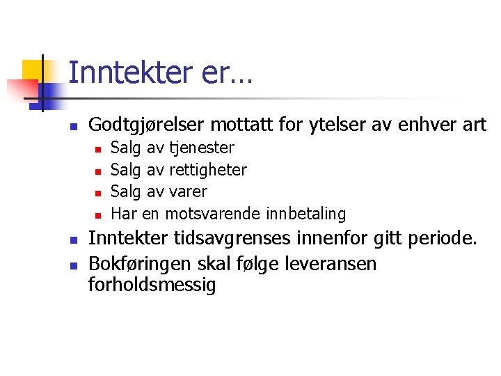 Inntekter er… n Godtgjørelser mottatt for ytelser av enhver art n n n Salg av tjenester Salg av rettigheter Salg av varer Har en motsvarende innbetaling Inntekter tidsavgrenses innenfor gitt periode. Bokføringen skal følge leveransen forholdsmessig