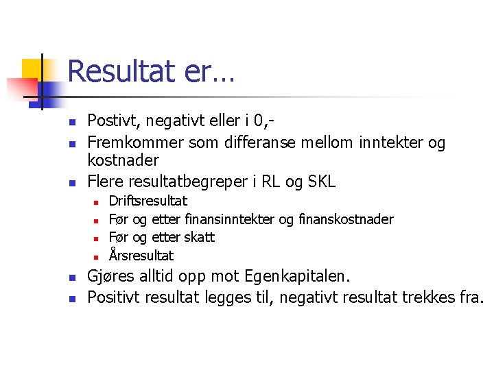 Resultat er… n n n Postivt, negativt eller i 0, Fremkommer som differanse mellom inntekter og kostnader Flere resultatbegreper i RL og SKL n n n Driftsresultat Før og etter finansinntekter og finanskostnader Før og etter skatt Årsresultat Gjøres alltid opp mot Egenkapitalen. Positivt resultat legges til, negativt resultat trekkes fra.