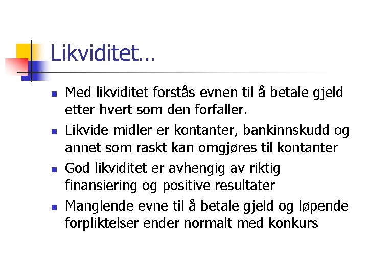 Likviditet… n n Med likviditet forstås evnen til å betale gjeld etter hvert som den forfaller. Likvide midler er kontanter, bankinnskudd og annet som raskt kan omgjøres til kontanter God likviditet er avhengig av riktig finansiering og positive resultater Manglende evne til å betale gjeld og løpende forpliktelser ender normalt med konkurs