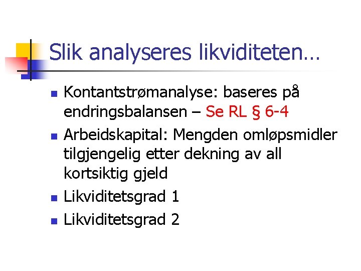Slik analyseres likviditeten… n n Kontantstrømanalyse: baseres på endringsbalansen – Se RL § 6 -4 Arbeidskapital: Mengden omløpsmidler tilgjengelig etter dekning av all kortsiktig gjeld Likviditetsgrad 1 Likviditetsgrad 2