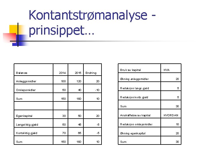 Kontantstrømanalyse - prinsippet… Balanse Bruk av kapital 2014 2015 Anleggsmidler 100 120 20 Omløpsmidler 50 40 -10 150 160 10 Sum Endring Økning anleggsmidler 20 Reduksjon langs. gjeld 5 Reduksjon korts. gjeld 5 Sum HVA 30 Egenkapital 30 50 20 Anskaffelse av kapital Langsiktig gjeld 50 45 -5 Reduksjon omløpsmidler 10 Kortsiktig gjeld 70 65 -5 Økning egenkapital 20 150 160 10 Sum 30 Sum HVORDAN