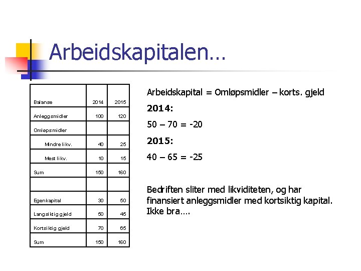 Arbeidskapitalen… Arbeidskapital = Omløpsmidler – korts. gjeld Balanse Anleggsmidler Omløpsmidler 2014 2015 100 120 2014: 50 – 70 = -20 Mindre likv. 40 25 2015: Mest likv. 10 15 40 – 65 = -25 150 160 Sum Egenkapital 30 50 Langsiktig gjeld 50 45 Kortsiktig gjeld 70 65 150 160 Sum Bedriften sliter med likviditeten, og har finansiert anleggsmidler med kortsiktig kapital. Ikke bra….