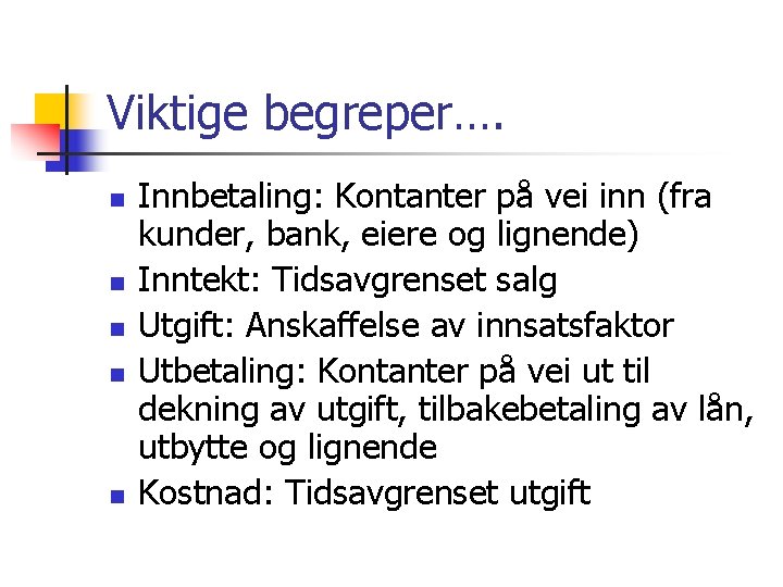 Viktige begreper…. n n n Innbetaling: Kontanter på vei inn (fra kunder, bank, eiere og lignende) Inntekt: Tidsavgrenset salg Utgift: Anskaffelse av innsatsfaktor Utbetaling: Kontanter på vei ut til dekning av utgift, tilbakebetaling av lån, utbytte og lignende Kostnad: Tidsavgrenset utgift