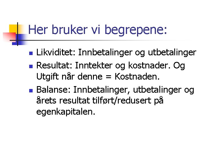 Her bruker vi begrepene: n n n Likviditet: Innbetalinger og utbetalinger Resultat: Inntekter og kostnader. Og Utgift når denne = Kostnaden. Balanse: Innbetalinger, utbetalinger og årets resultat tilført/redusert på egenkapitalen.