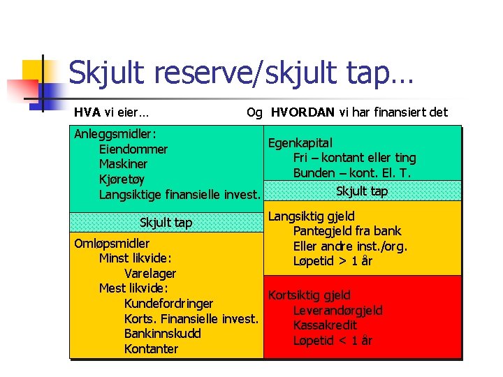 Skjult reserve/skjult tap… HVA vi eier… Og HVORDAN vi har finansiert det Anleggsmidler: Egenkapital Eiendommer Fri – kontant eller ting Maskiner Bunden – kont. El. T. Kjøretøy Skjult tap Langsiktige finansielle invest. Skjult tap Langsiktig gjeld Pantegjeld fra bank Eller andre inst. /org. Løpetid > 1 år Omløpsmidler Minst likvide: Varelager Mest likvide: Kortsiktig gjeld Kundefordringer Leverandørgjeld Korts. Finansielle invest. Kassakredit Bankinnskudd Løpetid < 1 år Kontanter