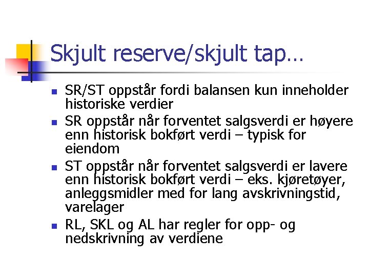 Skjult reserve/skjult tap… n n SR/ST oppstår fordi balansen kun inneholder historiske verdier SR oppstår når forventet salgsverdi er høyere enn historisk bokført verdi – typisk for eiendom ST oppstår når forventet salgsverdi er lavere enn historisk bokført verdi – eks. kjøretøyer, anleggsmidler med for lang avskrivningstid, varelager RL, SKL og AL har regler for opp- og nedskrivning av verdiene