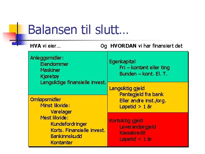 Balansen til slutt… HVA vi eier… Og HVORDAN vi har finansiert det Anleggsmidler: Egenkapital Eiendommer Fri – kontant eller ting Maskiner Bunden – kont. El. T. Kjøretøy Langsiktige finansielle invest. Langsiktig gjeld Pantegjeld fra bank Omløpsmidler Eller andre inst. /org. Minst likvide: Løpetid > 1 år Varelager Mest likvide: Kortsiktig gjeld Kundefordringer Leverandørgjeld Korts. Finansielle invest. Kassakredit Bankinnskudd Løpetid < 1 år Kontanter
