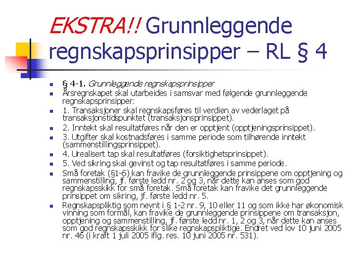 EKSTRA!! Grunnleggende regnskapsprinsipper – RL § 4 n n n n n § 4 -1. Grunnleggende regnskapsprinsipper Årsregnskapet skal utarbeides i samsvar med følgende grunnleggende regnskapsprinsipper: 1. Transaksjoner skal regnskapsføres til verdien av vederlaget på transaksjonstidspunktet (transaksjonsprinsippet). 2. Inntekt skal resultatføres når den er opptjent (opptjeningsprinsippet). 3. Utgifter skal kostnadsføres i samme periode som tilhørende inntekt (sammenstillingsprinsippet). 4. Urealisert tap skal resultatføres (forsiktighetsprinsippet). 5. Ved sikring skal gevinst og tap resultatføres i samme periode. Små foretak (§ 1 -6) kan fravike de grunnleggende prinsippene om opptjening og sammenstilling, jf. første ledd nr. 2 og 3, når dette kan anses som god regnskapsskikk for små foretak. Små foretak kan fravike det grunnleggende prinsippet om sikring, jf. første ledd nr. 5. Regnskapspliktig som nevnt i § 1 -2 nr. 9, 10 eller 11 og som ikke har økonomisk vinning som formål, kan fravike de grunnleggende prinsippene om transaksjon, opptjening og sammenstilling, jf. første ledd nr. 1, 2 og 3, når dette kan anses som god regnskapsskikk for slike regnskapspliktige. Endret ved lov 10 juni 2005 nr. 46 (i kraft 1 juli 2005 iflg. res. 10 juni 2005 nr. 531).