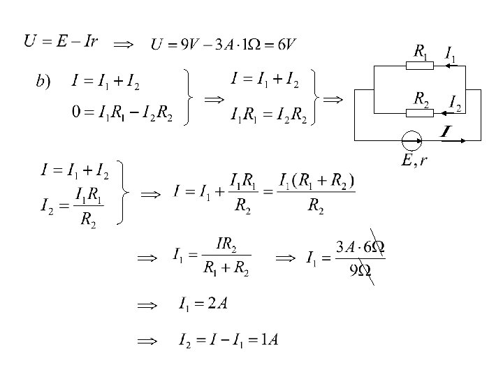 Un generator electric cu tensiunea electromotoare E=9 V și rezistența interioară r=1Ω alimentează un circuit electric, alcătuit din două rezistoare legate în paralel. Rezistențele rezistoarelor au valorile: R 1=3Ω si R 2=6Ω. Aflați: a) tensiunea la bornele bateriei; b) intensitățile curenților electrici stabiliți prin rezistoare. ( FIZICA-400 probleme şi 40 teste; D. Bacrău – Ed. Corint-Bucureşti-2003)