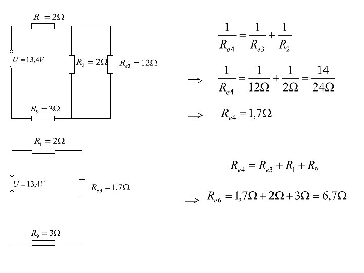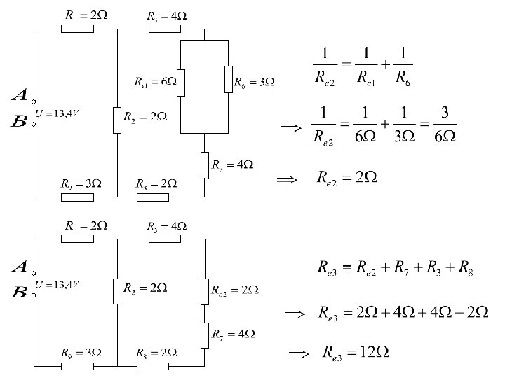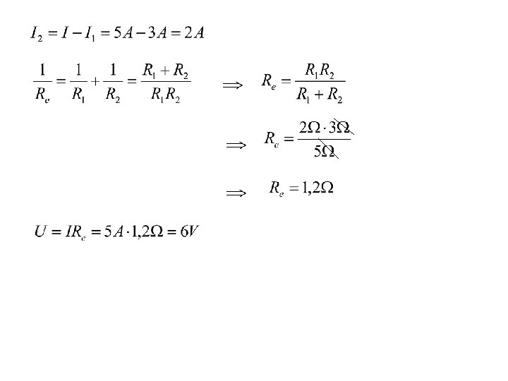 GRUPAREA REZISTENŢELOR Un curent electric de 5 A se desparte pe două conductoare de rezistenţe R 1=2Ω şi respectiv R 2=3Ω legate în paralel. Să se calculeze intensităţile I 1 şi I 2 ale curenţilor prin cele două rezistoare, rezistenţa echivalentă a grupării în paralel şi tensiunea de la bornele acesteia. ( Probleme de fizică pentru admitere în învăţământul superior, T. Creţu, D. Angelescu, I. Vieroşanu-EDP, Bucureşti, 1980 )