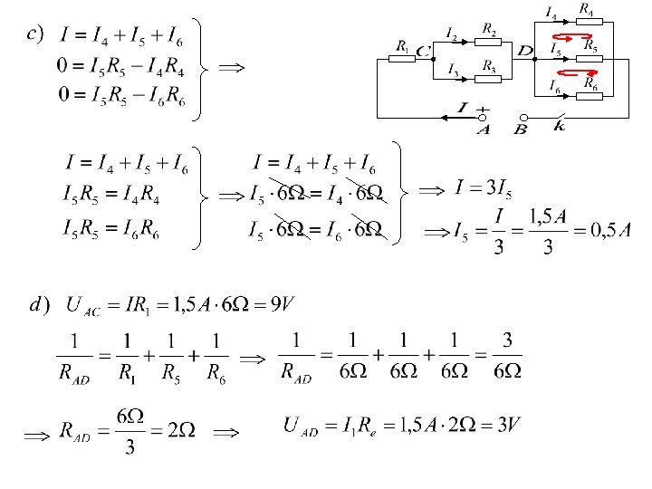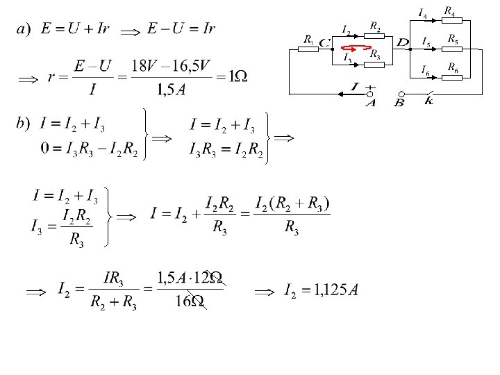 În circuitul reprezentat în figură, rezistoarele au rezistenţele : R 1=R 4=R 5=R 6=6Ω, R 2=4Ω, R 3=12Ω. Dacă întrerupatorul k este deschis, un voltmetru conectat între punctele A şi B indică U 1=18 V. Dacă întrerupatorul este închis, între aceleaşi puncte, voltmetrul indică U 2=16, 5 V, iar prin R 1 intensitatea curentului electric este I=1, 5 A. Se cere: a) reszistenta interioara a generatorului; b) intensitatea curentului electric prin rezistorul R 2; c) intensitatea curentului electric prin rezistorul R 5; d) tensiunile electrice dintre punctele AC, respectiv BD. ( FIZICA-400 probleme şi 40 teste; D. Bacrău – Ed. Corint-Bucureşti-2003)