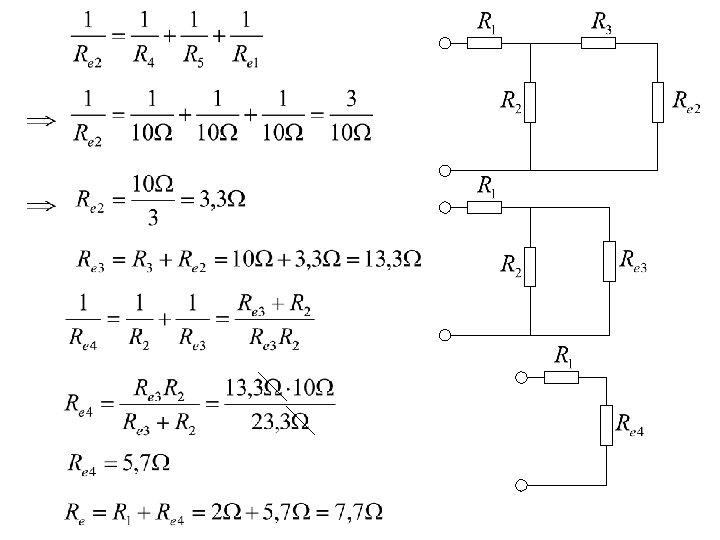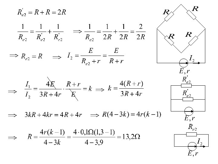 Un conductor cu rezistenţa electrică R se împarte în părţi egale şi se realizează un lanţ. Arataţi că oricare ar fi numărul verigiloor , lanţul rezultat are aceiaşi rezistenţa electrică. ( FIZICA-400 probleme şi 40 teste; D. Bacrău – Ed. Corint-Bucureşti-2003) Un conducor cu rezistenţa R împărţit în n părţi egale, produce n conductori, fiecare cu rezistenţa Rn=R/n. Se montează sub formă de lanţ, ca în figură. Fiecare verigă este împărţită în două parţi egale, fiecare cu rezistenţa Rn/2. Sunt n verigi grupate în serie, fiecare cu rzistenţa echivalentă Re. indiferent de n.