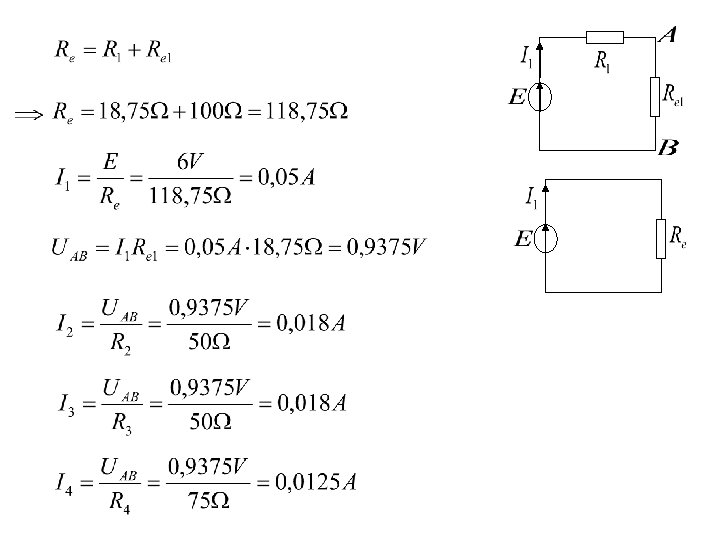 Care este rezistenţa echivalentă a reţelei din figură. Care sunt curenţii din fiecare rezistor? Se consideră următoarele valori: R 1=100Ω, R 2=R 3=50Ω, R 4=75Ω si E=6 V. ( Probleme de fizică pentru admitere în învăţământul superior, T. Creţu, D. Angelescu, I. Vieroşanu-EDP, Bucureşti, 1980 )