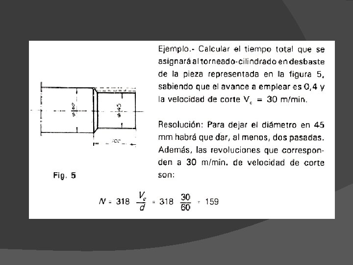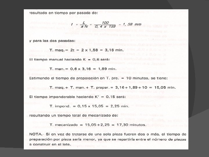 Tiempo de máquina, de corte o de mecanización El tiempo que se invierte en cortar el material de la pieza por medio de la herramienta puede ser calculado o más sencillamente, tomado del cuaderno máquina o de ábacos. � Su valor depende de la longitud a mecanizar, la velocidad de corte, diámetros de la pieza o herramienta, avance y número de pasadas � El tiempo total de corte es la suma de los tiempos de cada pasada �